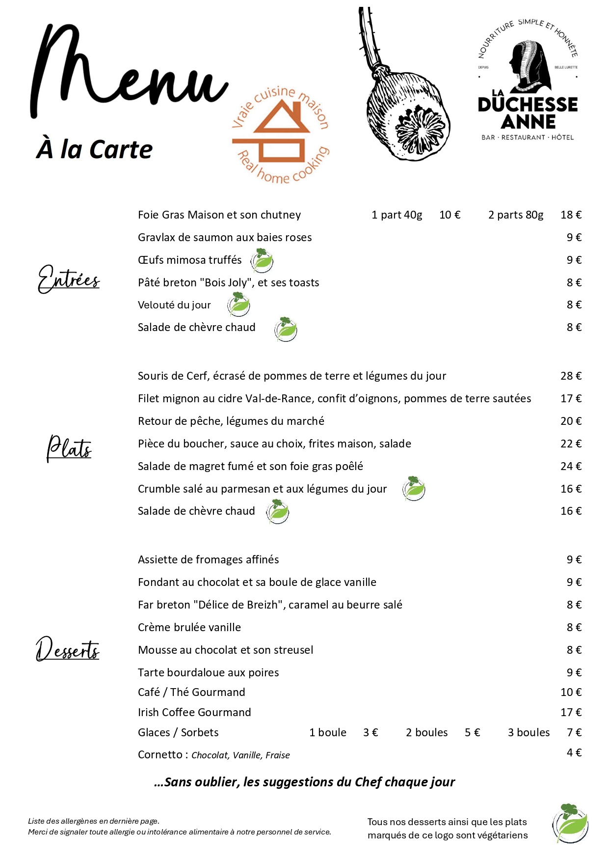 Parce que la convivialité passe aussi par l’attention portée à chacun, La Duchesse Anne propose également une sélection de plats végétariens, pensés pour plaire à tous les palais.